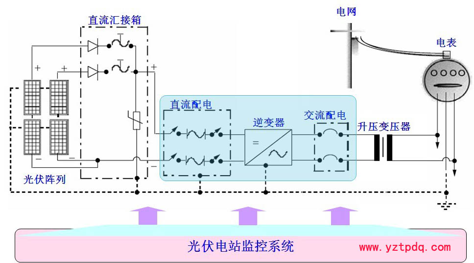 光伏并網(wǎng)發(fā)電系統(tǒng)是由光伏組件(方陣),光伏并網(wǎng)逆變電源,防雷匯流箱,交直流防雷配電柜及光伏電站運(yùn)行監(jiān)控系統(tǒng)組成。