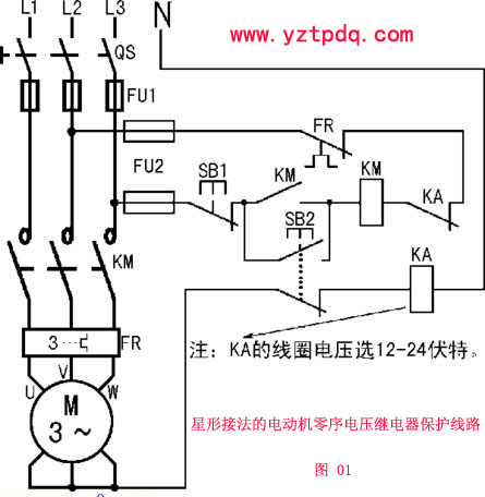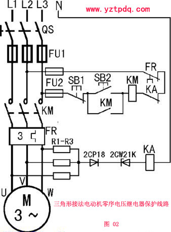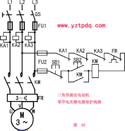 圖02所示為三角形接法電動機零序電壓繼電器保護線路。