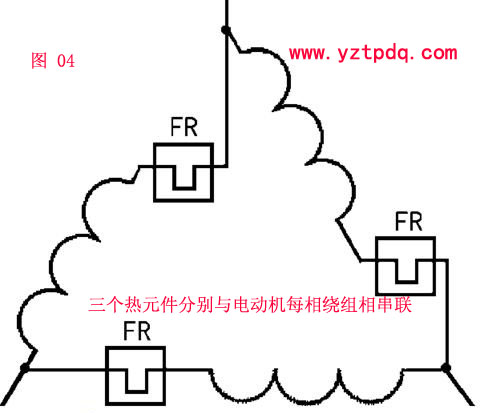 把普通熱繼電器的三個熱元件分別與電動機每相繞組相串聯(lián),如圖04所示。