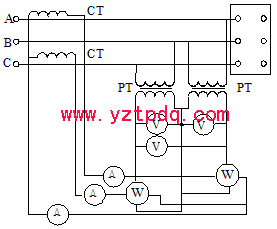 對于單相電力變壓器,可采用圖1-1所示的接線進行空載試驗。對于三相電力變壓器,可采用圖1-2和圖1-3所示的兩瓦特表法進行空載試驗。圖1-2為直接測量法,適用于額定電壓和電流較小,用電壓表和電流表即可直接進行測量的電力變壓器。當電力變壓器額定電壓和電流較大時,必須借助電壓互感器和電流互感器進行間接測量,此時采用圖1-3接線方式。
