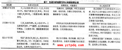 珞珈山3號(hào)主變、江漢路1號(hào)主變和花山1號(hào)主變的色譜分析結(jié)果、故障原因以及吊心檢查結(jié)果見表3。