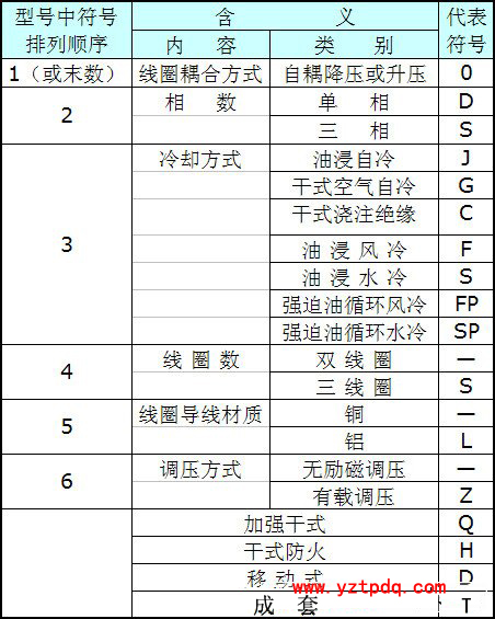 變壓器繞組數(shù)+相數(shù)+冷卻方式+是否強(qiáng)迫油循環(huán)+有載或無載調(diào)壓+設(shè)計(jì)序號(hào)+“-”+容量+高壓側(cè)額定電壓組成。