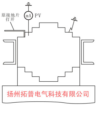 3)交流電流法。在變壓器低壓繞組通入交流電壓220~380V,此時(shí)鐵芯中有磁通流過。如果有接地故障,用毫安表測量會有電流。當(dāng)毫安表沿鐵軛各級逐點(diǎn)測量,毫安表指示電流為零時(shí),該處為接地點(diǎn)。