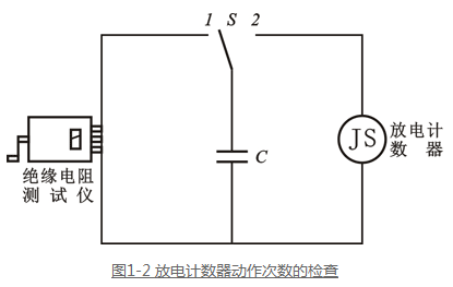 為了檢查放電計數(shù)器動作是否正常,一種方法是用沖擊電流發(fā)生器給計數(shù)器加一個幅值大于100A的沖擊電流,看其是否動作。圖1-2示出了一種適宜現(xiàn)場采用的簡易試驗方法。用一個1000V或2500V絕緣電阻測試儀給一個電容量約為5~10μF的電容器充電,然后用電容器通過放電計數(shù)器放電,計數(shù)器應當動作。試驗時應注意: