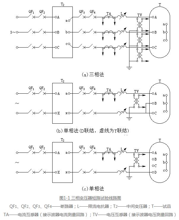 3、對(duì)于三角形聯(lián)結(jié)的繞組進(jìn)行三相試驗(yàn)時(shí),如果低壓側(cè)為星形聯(lián)結(jié),可采用測(cè)量低壓電流的方法;對(duì)于三角形聯(lián)結(jié)的繞組進(jìn)行單相試驗(yàn)時(shí),單相電壓應(yīng)施加在三角形的兩個(gè)角上,試驗(yàn)時(shí)的電壓應(yīng)與三相試驗(yàn)時(shí)的相間電壓相同;對(duì)于星形聯(lián)結(jié)繞組,如果電源容量不足以進(jìn)行上述單相試驗(yàn),而中性點(diǎn)可以利用且能承受相關(guān)的電流時(shí),經(jīng)協(xié)商單相電源可施加于線端與中性點(diǎn)之間;具體的短路試驗(yàn)的線路原理見圖1-1。