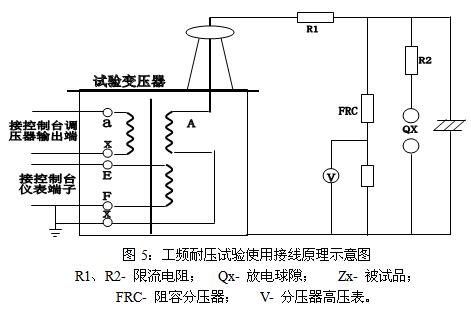 1、TPSBJ系列高壓試驗變壓器做工頻耐壓試驗使用接線方法見圖5。做工頻耐壓試驗前,先根據(jù)試驗變壓器的額定容量選擇好限流電阻,(水電阻)的阻值,再根據(jù)被試品需加的高壓電壓值調(diào)整好放電球隙的球間距,為了提高對被試品施加電壓的測量精度,應在高壓側接入FRC阻容分壓器來測量電壓。