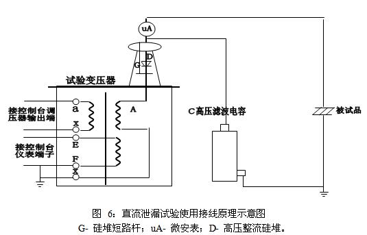 按照圖所進行的直流泄漏試驗接好工作線路。試驗變壓器的高壓繞組的X端(高壓尾)、儀表測量繞組的F 端、試驗變壓器的外殼以及電源控制箱(臺)的外殼必須可靠接地。