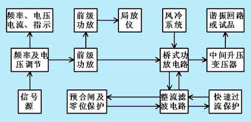 電源裝置的大功率輸出采用逐級放大的原理(見圖)。從zui初的微小功率信號源,經(jīng)過多次放大,實現(xiàn)大功率輸出,滿足試驗需要。