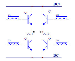 圖中,Q1~Q 4為四個等效三極管,分別對應變電源的四個橋臂。每個橋臂由數(shù)千只三極管并聯(lián)組成,并采取了有效的均衡電流措施。正半周時,前級放大信號通過推動變壓器(T1~T4)作用于Q1~Q4三極管的基極,Q2,Q3截止;Q1,Q4導通,電流由Q1至負載再到Q4形成正弦波的正半周。負半周時模擬信號推動Q2,Q3的基極,Q1,Q4截止,Q2,Q3導通, 電流由Q3至負載再至Q2形成正弦波的負半周, 從而在負載上構(gòu)成一個完整的正弦波。