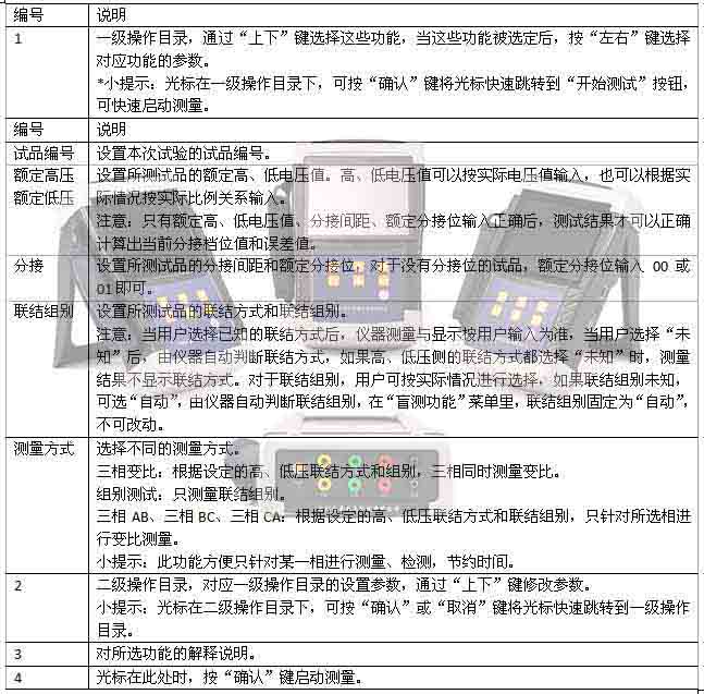 對于具有多個分接位的變壓器,輸入額定高、低壓電壓值、分接間距、額定檔位,是為了使測試結(jié)果可以自動計(jì)算出誤差值,以及分接開關(guān)所處的分接位。