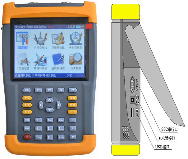 拓普品牌多功能手持式全自動變比測試儀采用大屏幕真彩色液晶屏顯示,全中文圖形化操作界面并配有漢字提示信息、多參量顯示的液晶顯示界面,人機對話界面友好,向量圖顯示及接線判斷為檢查電路的正確性提供了可靠的依據。全觸摸式導電硅膠鍵盤操作方式,操作手感好,簡便易學。儀器內置大容量掉電不丟失數據存儲器,可將現場校驗數據保存下來,可擴展存儲1000組現場校驗結果。儀器除具有完全根據用戶的現場使用要求,操作簡便,功能完備,數據穩(wěn)定可靠的特點外還是國內到目前為止一款可以進行盲測(不知道被測變壓器的任何銘牌參數的情況下準確測量變比值和組號,同時能準確測量相角)的手持式變比測試儀;能適應各種大中小型變壓器變比測試的需要(包括Z型變、整流變、電爐變、非整點的移相變、牽引變、斯科特及逆斯科特變壓器),是到目前為止國內變比測試中技術先進,測試項目完善,測量參數較全面的變比測試儀。