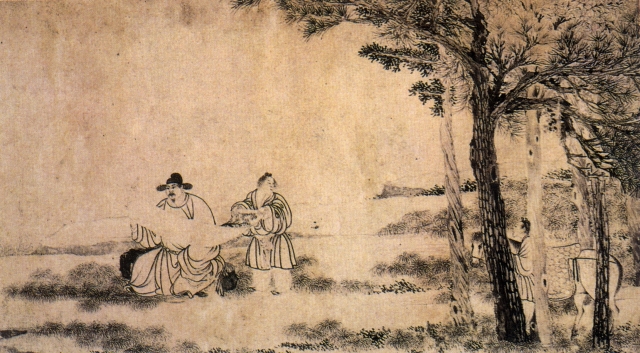 在故宮博物院眾多藏品中,有一幅引人注目的《云中送別圖卷》。畫面上一人峨冠溥帶,獨坐松坡之上,一僮子侍后。兩人手展畫卷,峨冠者凝神而視。樹下一僮子手牽鞍馬,整裝待發(fā)。人物形神兼?zhèn)?,衣紋線條流暢。左方叢林石壁,筆法粗放,墨氣淋漓。這幅兼工帶寫的紙本墨筆畫,收人了《中國繪畫史圖錄》,作者就是明代著名畫家陶成。