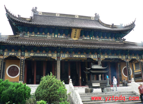 從山門進(jìn)入寺院,首先映人眼簾的是前殿。大雄寶殿的正中是釋迦牟尼裝金佛像,佛體神圣莊嚴(yán),神態(tài)慈祥端莊,仿佛正時(shí)時(shí)處處關(guān)切著所有向他膜拜的人們。佛龕呈六角狀,六根木雕龍柱工藝精湛,佛龕的頂部站立著伸展巨翅的靈鷲。aixiangbo.com靈鷲山俗稱靈山,因山上多靈鷲而得名。傳說釋迦牟尼當(dāng)年就在靈山傳經(jīng)布道。大雄寶殿兩側(cè)沒有像一般寺院那樣矗立十八尊羅漢法身塑像,而是供奉竹禪大師題跋書畫十八尊羅漢像的浙江天童寺“照畫石刻’’拓片。照畫石刻拓片十八尊羅漢像,具有很高的藝術(shù)價(jià)值,在當(dāng)今漢傳佛教中十分罕見。