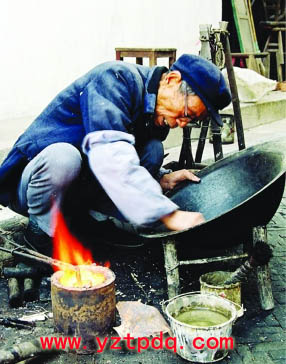 補(bǔ)鍋匠左手拉著風(fēng)箱,右手提過(guò)鍋,放在鋪有草木灰的地上,aixiangbo.com用一只小巧玲瓏的鐵錘,在要補(bǔ)的四周輕輕地敲打。