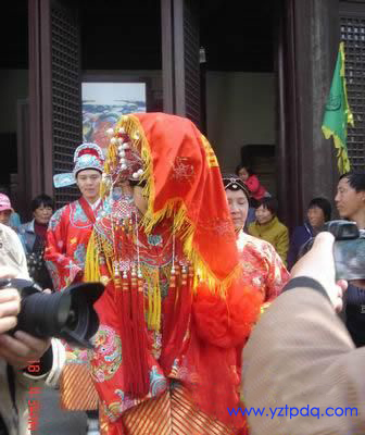 活動在東門城樓開始,帶大家體驗穿越時空的喜慶場面。4月18日下午,作者在揚州東門城樓,親自體驗了下“夢回明清,愛在揚州”古典婚嫁。