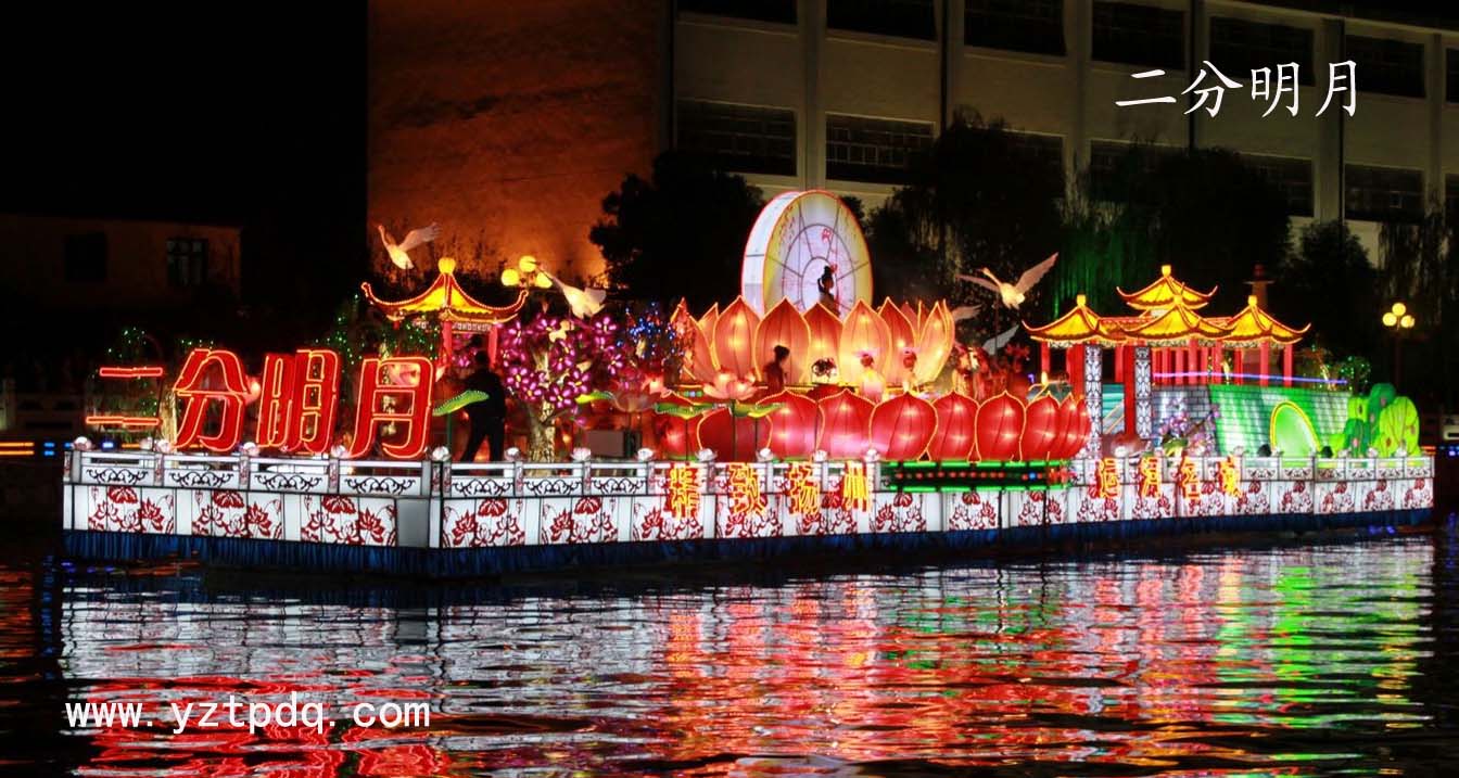 由蜀岡—瘦西湖風(fēng)景名勝區(qū)制作的領(lǐng)航花船“二分明月”號(hào)。該花船以國(guó)家5A級(jí)風(fēng)景區(qū)蜀崗—瘦西湖為藍(lán)本建構(gòu)。風(fēng)姿卓越獨(dú)樹(shù)一幟的五亭橋,寓意著幸福年年,代表著人類(lèi)的智慧與巧思?;始艺洳匾撇綋Q景的白塔,見(jiàn)證著鹽運(yùn)的發(fā)達(dá),代表著至高的榮耀與尊寵。亭臺(tái)軒榭、層巒疊嶂、青山掩翠、桃紅柳綠,好一個(gè)荷塘月色,人間仙境。