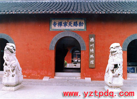 抗日戰(zhàn)爭期間,天寧寺為侵華日軍所占,淪為兵營。由于年久失修,使用不當,至70年代末,已面目全非。自1984年夏,共耗資141萬元進行大修。大修后的天寧寺占地908平方米,建筑面積5000多平方米,中軸線上有山門殿、天王殿、大雄寶殿、華嚴閣,兩側(cè)廊房92間。整個建筑布局對稱、嚴謹。山門殿單檐歇山頂,面闊3間。天王殿亦為單檐歇山頂,四面有廊,面闊5間284米。大殿重檐歇山頂,四面有廊,前后有月臺,面闊5間328米,進深15檁25米,脊檁高19米。殿后走廊東壁嵌有清同治十一年(1872年)立《重修天寧寺碑》,西壁嵌有1987年立《重修天寧寺碑記》。修復后,用作揚州博物館新址,對外開放。