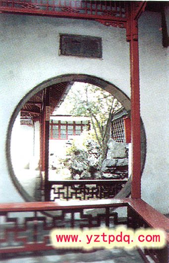 東院以回廊通連,南向植細桿梧桐,瘦長如修竹,饒有清妍之姿。經回廊達半亭,亭欄臨水,池水由此北折,水池盡頭,有軒三間,池邊花壇上置數點峰石,小徑用鵝卵石砌鋪。游人至此,雖則地已窮盡,但隨路一轉,或東登半亭,或緣池西去,達于園之西部。