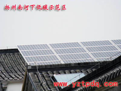 昨天上午,記者在南河下低碳示范區(qū)內看到,戶外路燈已經安裝結束。項目負責人介紹,這些路燈都是采用的節(jié)能燈,電源全部來自太陽能光伏板發(fā)電。項目負責人將記者帶進項目展示區(qū)的3號樓二樓平臺,兩名技術人員正在平臺一個“人”字頂上安裝光伏板,光伏板面積為10多平方米。“光伏板分別安裝在3號樓和11號樓平臺上,共有24塊板子,總發(fā)電能力為4.32千瓦。”該項目負責人介紹,整個路燈的供電全部依賴上述太陽能發(fā)電。