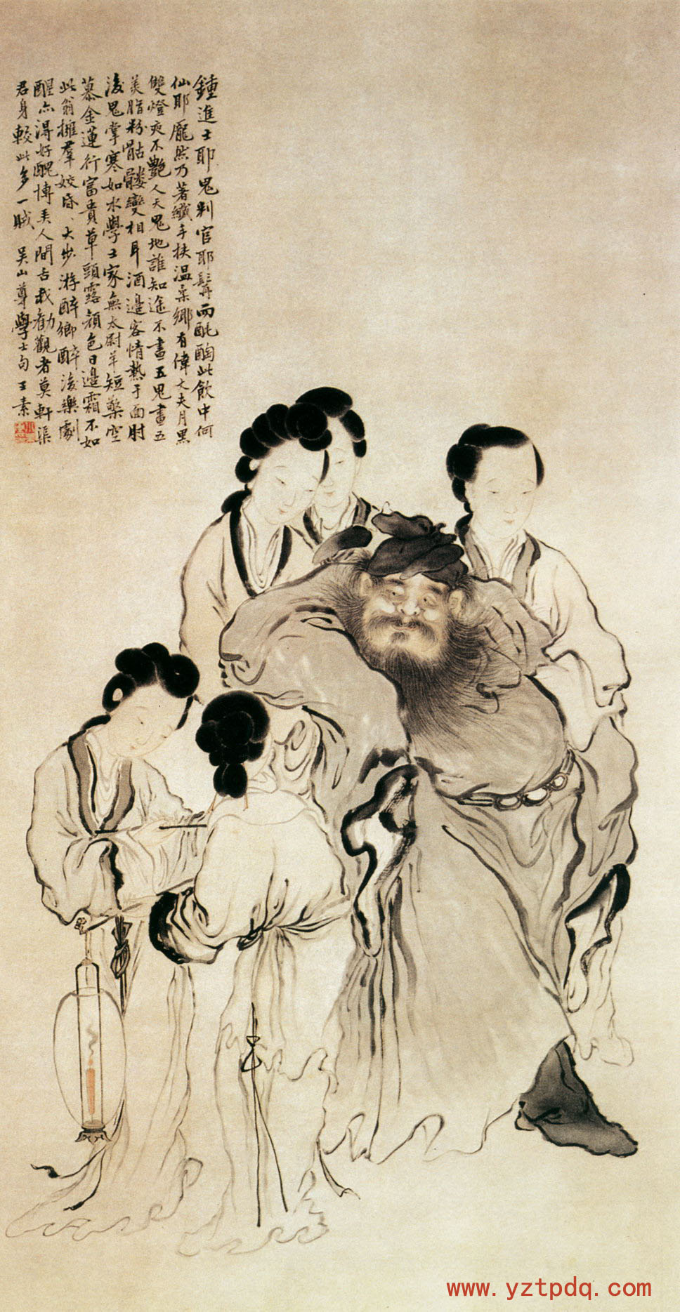 【鐘馗圖】描繪五仕女簇擁著酒醉的鐘馗夜歸的情景。鐘馗作張髯大腹、步履蹣跚之狀,雙目斜視,左右脅各有攙扶侍女一人,后側一侍女護送。侍女頭部發(fā)髻烏黑光亮,臉部敷脂抹粉,體態(tài)輕盈,衣褶飄逸。鐘馗寬袍束帶,以淡墨疾筆寫衣褶,作蘭葉描。人物畫法,以工帶寫。左上自錄吳山尊雜詩一章,詩意揭露世態(tài)炎涼,不如盡醉為樂。此畫是王素人物畫中的佳作。