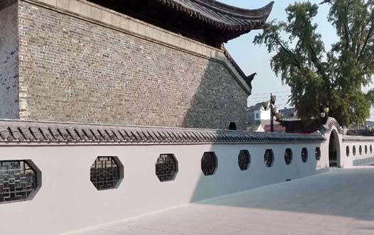 二期工程主要包括學(xué)宮圍墻的建立。因?qū)殤?yīng)學(xué)宮在寶應(yīng)城中小學(xué)內(nèi),為保證學(xué)生的人身安全,同時(shí)也出于保護(hù)古建筑的目的,寶應(yīng)學(xué)宮在大成殿和明倫堂的外圍建立了仿古圍墻。整個(gè)圍墻仿明清時(shí)代建筑風(fēng)格,建造的扇形拱門鑲上了花邊屋檐,引人入勝,更仿造古典園林造園藝術(shù),在圍墻上裝上了花格窗,以達(dá)到“移步換景”的目的。透過(guò)花格窗向里看寶應(yīng)學(xué)宮,更別有一番風(fēng)味。