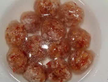 做藕粉圓子首先是制作圓子餡。將花生仁、芝麻仁、核桃仁炒熟焙干分別碾成細(xì)末。將紅棗或大棗煮爛去皮,加糖熬成糖泥后,分別與上述三種仁末同拌,做成小丸,成花生、芝麻、核桃餡料丸。將干藕粉散放在竹匾內(nèi),取丸餡在匾中滾動,粘上藕粉,取出,噴灑上微水,再入藕粉匾中滾過,再取出,再噴水,再滾過,直至藕粉圓子坯大小適當(dāng)為好。也有人將圓子生坯沸水內(nèi)一過,再入匾中滾藕粉增大。后者方法做圓子雖快,但圓子表面粗糙,大小也難以一致。做藕粉圓子的高手所做出的藕粉圓子看上去大小一樣,表面光滑,賞心悅目。吃到口里是軟、綿、糯、香。下藕粉圓子并不復(fù)雜,和下普通圓子基本相似。鍋內(nèi)藕粉圓子在沸湯中浮起后,再加入一點(diǎn)冷水,再待湯沸鍋中的圓子全部上浮,呈半透明狀,圓子起暗紅色,即可用漏勺撈出盛到配有桂花糖鹵的碗中上席。